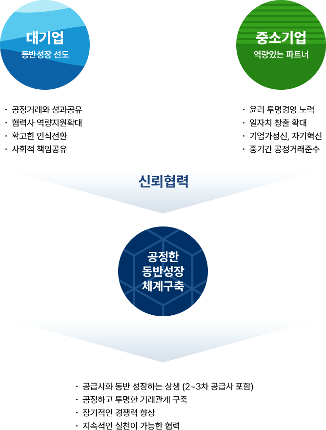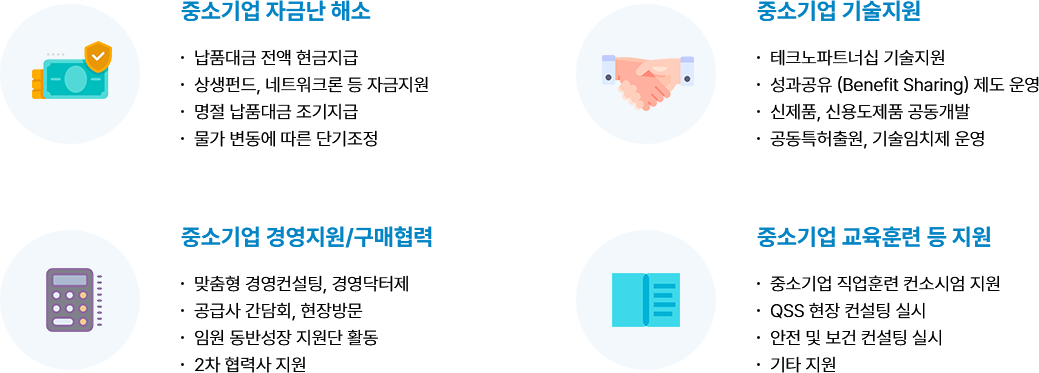 신뢰관계를 기반으로 중소기업의 경영개선을 위해 맞춤형 컨설팅, 간담회, 2차 협력사 지원등의 프로그램을 운영