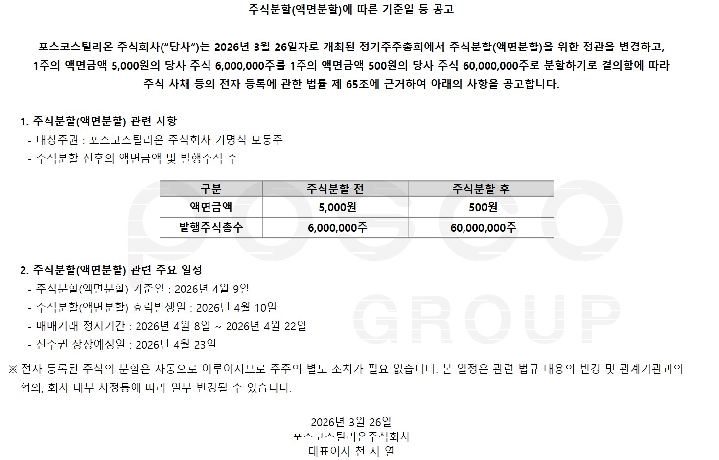 주식분할(액면분할)에 따른 기준일 등 공고