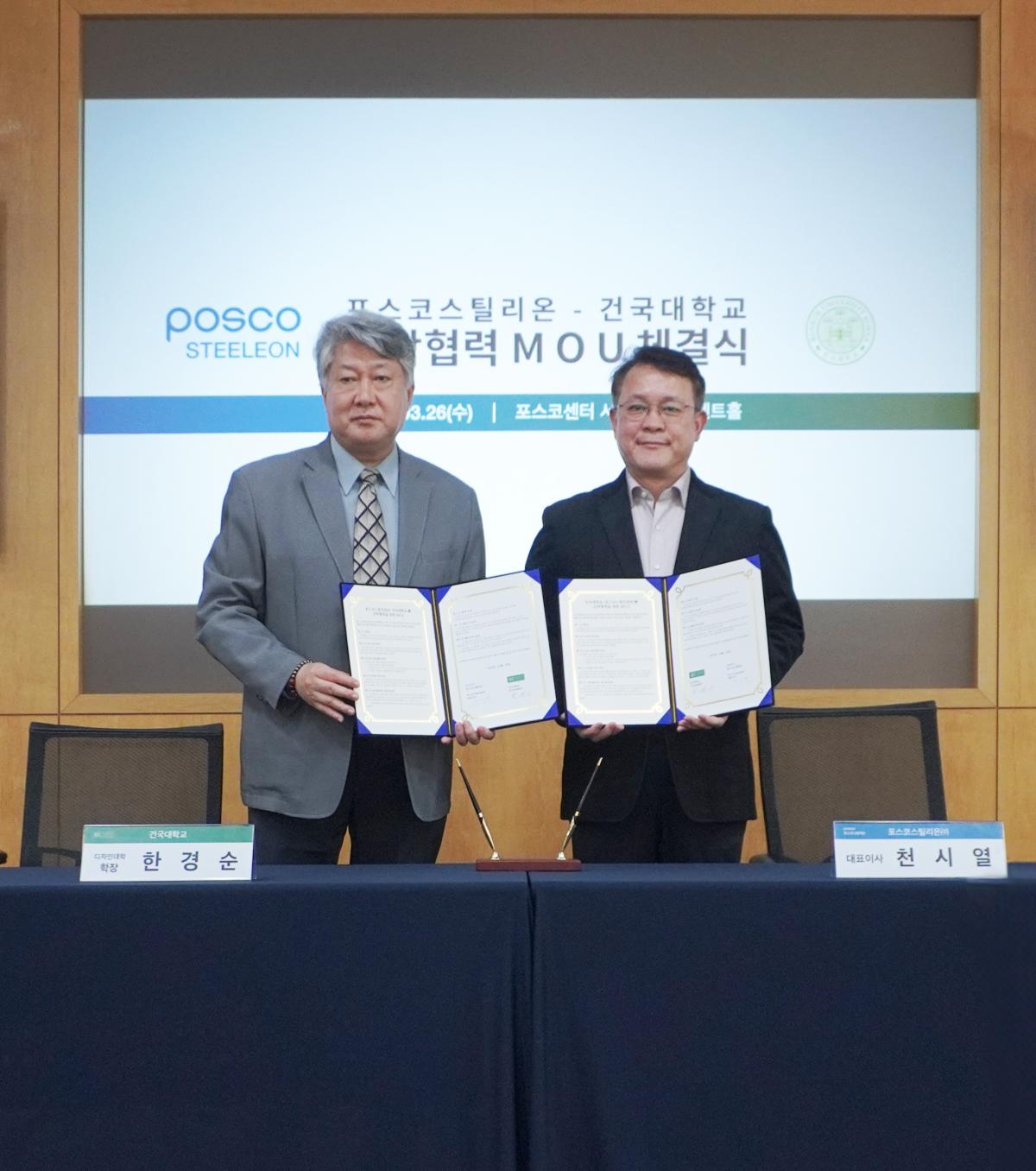 포스코스틸리온은 지난 26일 강남구 포스코센터에서 건국대 디자인대학과 자사의 컬러강판 브랜드인 ‘인피넬리(INFINeLI)’ 디자인 공동 개발에 관한 산학 협약 MOU을 맺고,